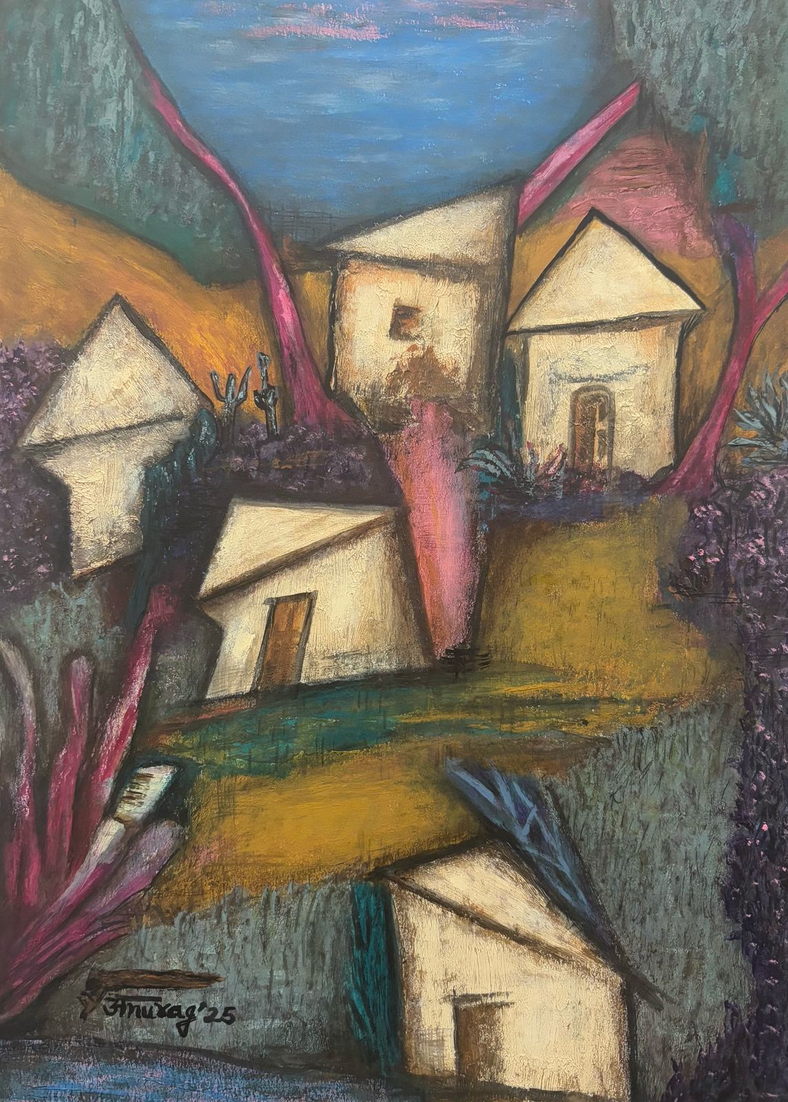 Surrounding these built structures, the landscape unfolds in patches of muted purples, blues, browns, and greens, suggestive of distant hills and a dusky sky. The trees, stylized and vertically exaggerated, contribute a lyrical verticality that contrasts with the horizontal flow of the terrain. Rendered in an evocative palette of pinks, purples, browns, and deep greens, these organic forms echo the abstract sensibility of the overall composition, while also suggesting a natural world in flux, poised between stillness and motion. The work’s palette, punctuated by subtle touches of pale mustard-yellow and olive-green, adds depth and tonal variety, enriching the atmospheric quality of the painting. These chromatic fields are blended in a layered, almost collage-like manner, lending the piece both visual texture and a sense of meditative complexity.