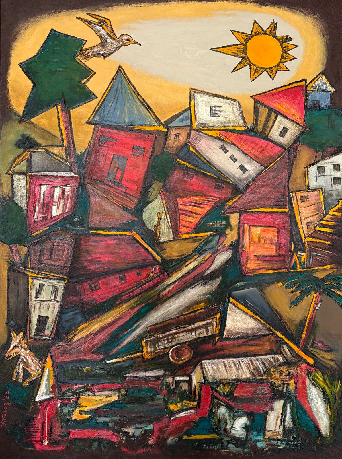 A bright yellow sun radiates from the upper right quadrant, casting a symbolic warmth that animates the surrounding forms. Its intensity is mirrored by a flying pale-yellow bird, whose trajectory across the sky adds a moment of dynamism and visual release. In the foreground, a single stylized tree anchors the organic within the architectural, introducing a note of contemplation amid the chaotic clustering of built forms. The earthy, muted brown and dark grey background provides a contrasting ground for the vibrancy of the structures. This tonal counterbalance gives depth and spatial resonance to the otherwise flat pictorial plane. A small, indistinct animal or figure, located near the bottom left, acts as a subtle point of intrigue its presence enhancing the painting’s narrative ambiguity.