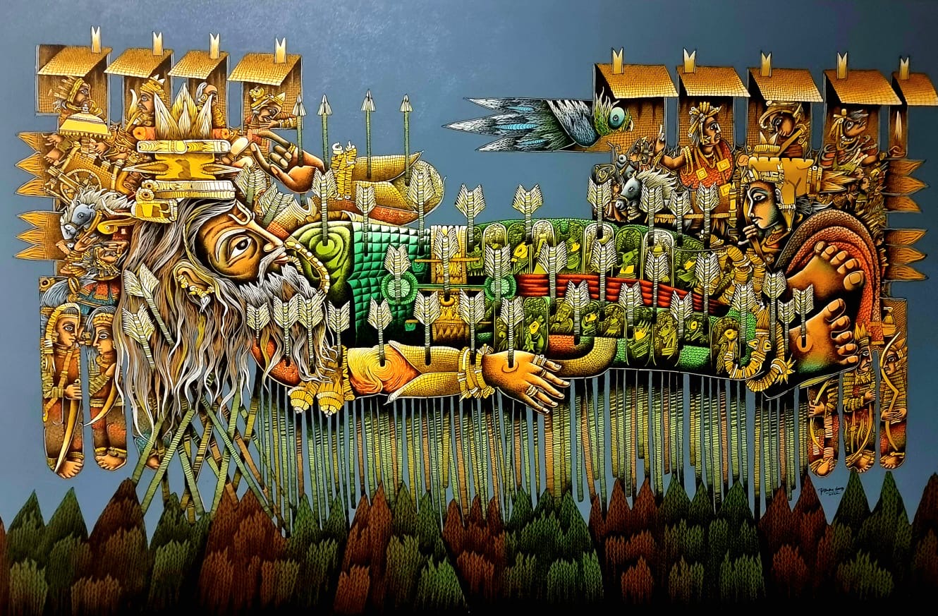 Bhishma Updesh is a visually compelling and richly detailed interpretation of a pivotal episode from the Mahabharata, where the warrior-elder Bhishma, lying on a bed of arrows, imparts his final teachings. This mythological scene is rendered with Dangi’s distinctive blend of folk idioms and contemporary intricacy, creating a work that bridges sacred narrative with visual complexity. At the center of the composition lies the monumental figure of Bhishma, his body pierced by a multitude of arrows that both convey the brutality of war and the stoic endurance of the character. His form is rendered with an extraordinary attention to ornamentation, golden accents on his crown and armor, patterned textiles, and embellishments in earthy greens, reds, and ochres, which elevate his physical suffering into a noble tableau of sacrifice and wisdom. Bhishma’s horizontal pose dominates the visual field, underscoring his importance both as a character and as a symbol of dharma.