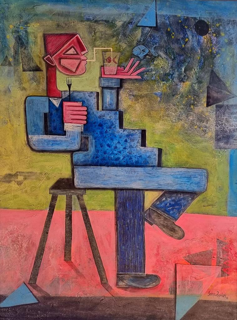An engaging abstract composition captures a moment of quiet indulgence through a seated figure rendered in a distinctly cubist-inspired style. The painting’s bold geometric shapes and carefully orchestrated color palette invite viewers into an intimate scene that balances formal abstraction with a sense of everyday ritual.