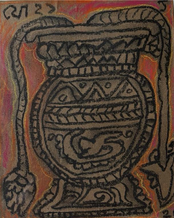 The presence of a simple script-like mark in the top left corner, possibly a signature or a symbolic glyph, reinforces the work’s interweaving of visual and linguistic codes, an aspect often found in Chowdhury’s drawings. His use of brown paper further contributes to the work’s tactile and archival quality, echoing the materiality of indigenous art forms while grounding the work in the idiom of the handmade. In this drawing, Jogen Chowdhury reimagines a humble vessel as a carrier of cultural memory and artistic invention, transforming it into an object of meditative beauty and layered symbolism.