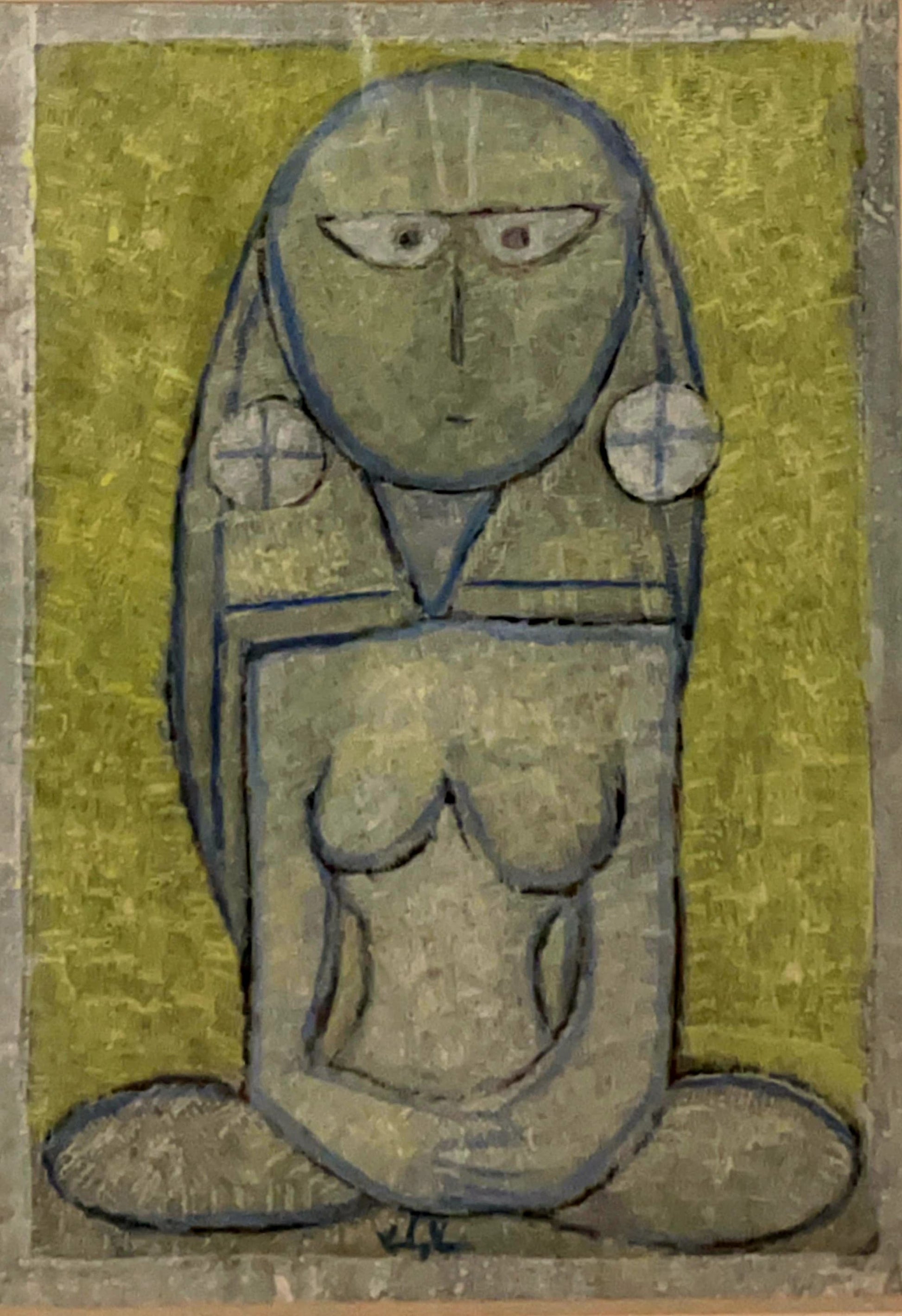 Subtle motifs, circular and cross-like forms near the shoulders and head, introduce a sacred or ritualistic subtext, drawing the viewer’s attention to symbols that hover between decorative design and spiritual reference. These additions do not distract from the central figure but extend her into a larger cosmology, as if she is both individual and archetype. The background, a field of yellow-green with slight tonal modulation, offers a quiet counterpoint to the solidity of the figure. Brushwork remains visible, lending a tactile surface to the canvas. Kulkarni’s choice of a restricted palette, subdued in chromatic range, sharpens focus on compositional harmony and symbolic geometry.
