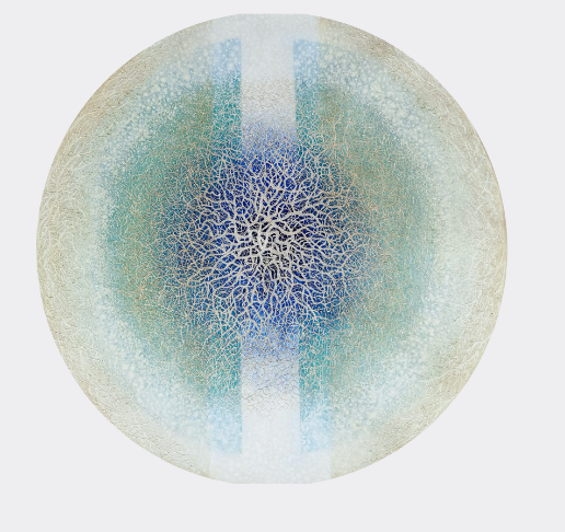 The use of a circular format further underscores themes of wholeness and infinity, with no beginning or end, echoing ancient symbolic representations of unity and the cosmos. The radiant blues, ranging from deep indigo to shimmering cerulean, evoke both the depth of the universe and the serenity of introspective experience, balancing visual intensity with emotional resonance.
