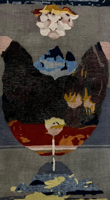 Das Gupta’s use of texture in the wool medium adds a tactile dimension to the work, enhancing its depth and inviting closer inspection. The surface reveals layers of woven patterns and undulating shapes that ripple across the composition, suggesting reflections on water or the shifting landscapes of memory. This dynamic interaction between form and surface amplifies the artwork’s contemplative mood, encouraging an immersive experience of balance and flux. Delicate floral motifs punctuate the composition, their organic curves and soft outlines providing a poetic counterpoint to the abstract geometric structures. These botanical elements not only enrich the visual complexity but also symbolize growth, renewal, and the cyclical nature of life, reinforcing the themes of transformation and harmony that permeate the work.