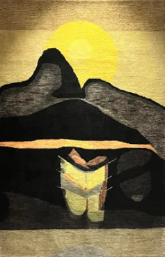 Das Gupta’s masterful use of texture through the medium of wool enhances the tactile and visual depth of the artwork. The rug’s surface conveys a rich layering of forms, where the rugged contours of mountains contrast with the smooth radiance of the sun, creating a dynamic balance that draws the eye across the composition. This textured approach not only highlights the physicality of the medium but also deepens the symbolic resonance, inviting reflection on the coexistence of light and darkness, presence and absence.