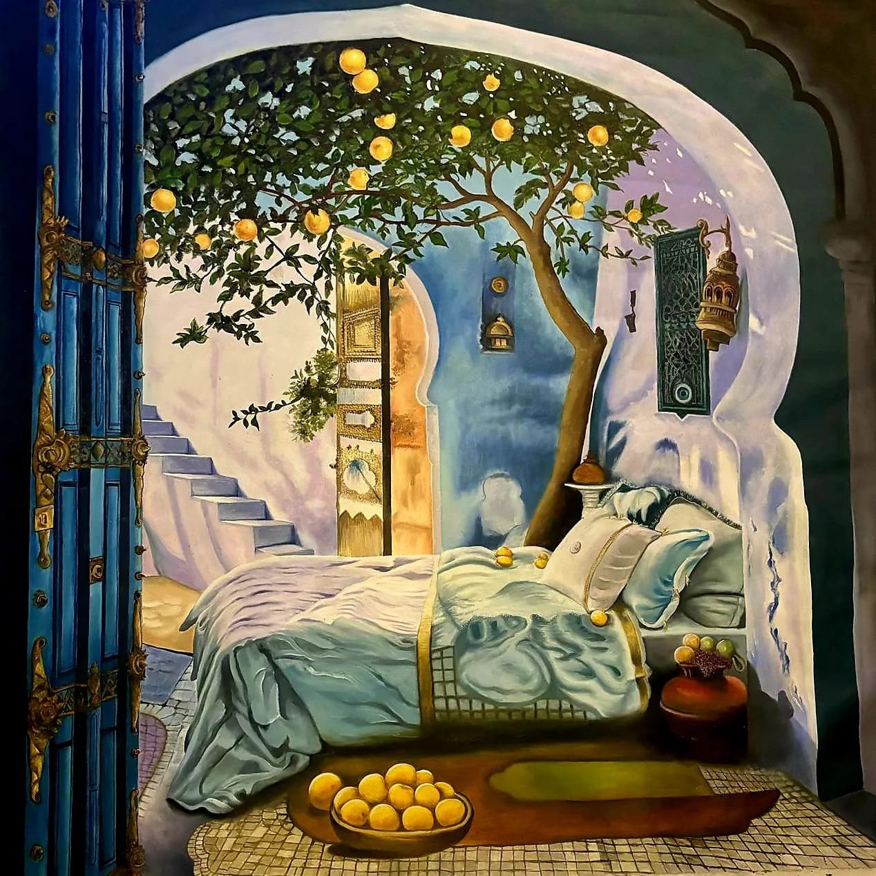 The spatial arrangement invites viewers to contemplate a harmonious coexistence of nature and domesticity, the fruiting tree growing directly within the interior space, casting delicate shadows that suggest both movement and stillness. This interplay resonates with Moorish architectural principles, where courtyards and gardens are integral to interior design, creating environments that blend indoor comfort with the natural world outside. Additional decorative elements, including a dark, intricately wrought Moroccan-style door and an ornate metal lantern affixed to the wall, enrich the scene with cultural specificity and visual texture. The door, partially open to reveal a softly lit stairwell, offers a subtle narrative hint of transition and exploration within this quiet sanctuary. A dark, patterned rug at the foot of the bed further grounds the composition, introducing contrast and depth.