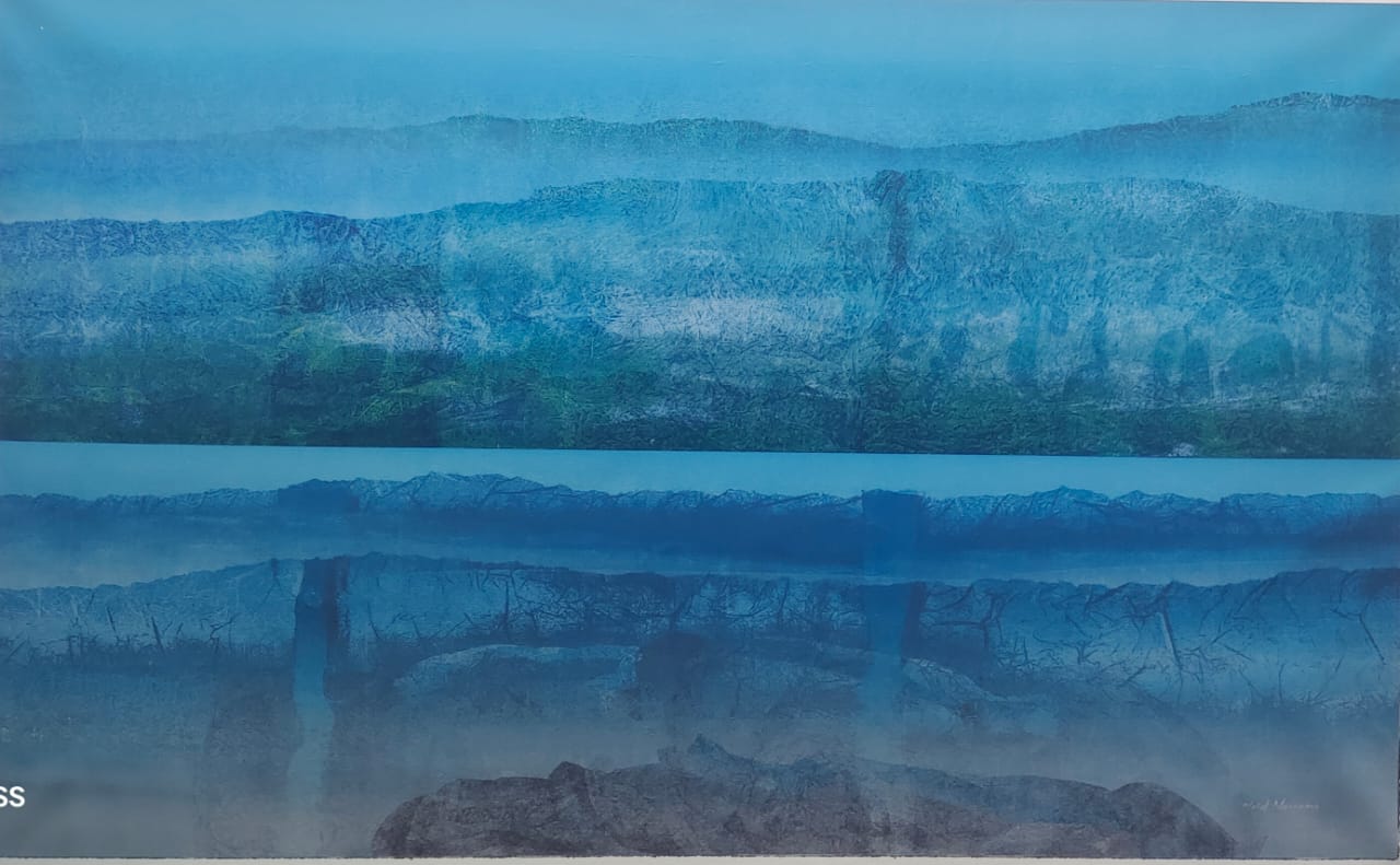 Rather than opting for a topographical or photorealistic portrayal, Naseem adopts a stylized, almost dreamlike approach. The composition is articulated through a series of softly layered mountain silhouettes, cascading from foreground to background in subtle gradations of blue, from the lightest teal to the deepest azure. This chromatic progression evokes a sense of atmospheric perspective, enhancing the illusion of depth while also reinforcing the emotional tenor of the work. The inclusion of a horizontal band of lighter blue, separating the layers of terrain, introduces a luminous spatial interval, perhaps suggestive of mist, fading light, or the breath of the earth itself.