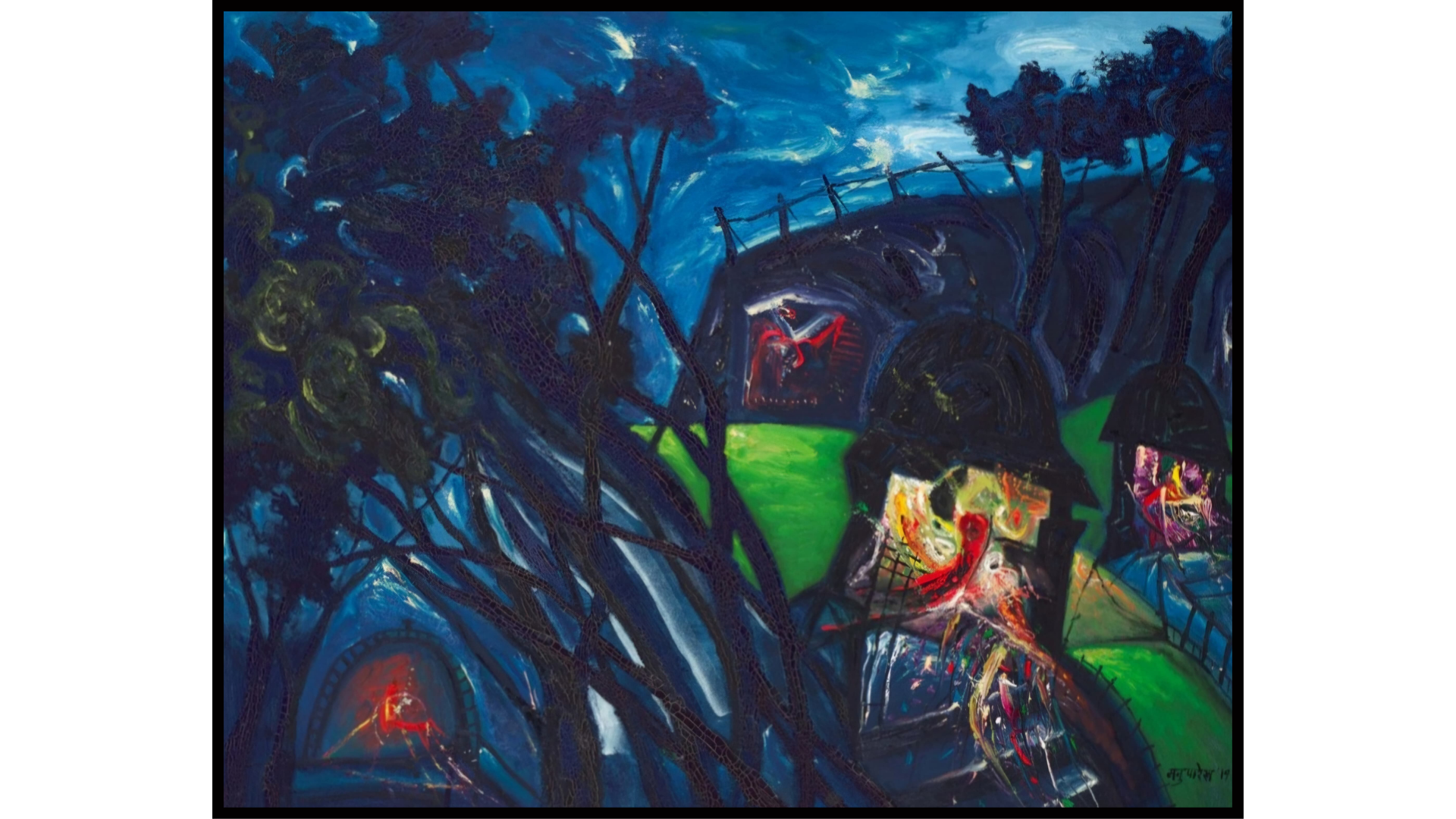 Known for his long-standing engagement with Banaras as a site of metaphysical resonance, Parekh here captures not a literal view but an emotional landscape, where the environment becomes a vessel for devotion, memory, and transformation. The sweeping arcs of dark trees frame the composition like guardians of the sacred, bending under the weight of monsoon winds while pointing skyward, symbols of both endurance and surrender. Below, radiant shrines seem to glow from within, their warmth resisting the encroaching blues and grays of storm and sky.