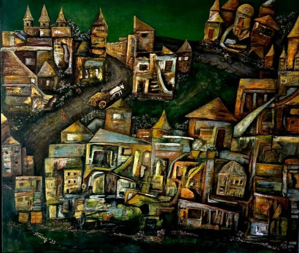 Anurag Anand’s intricate, executed in acrylic on linen canvas, masterfully captures the delicate balance between nostalgia and modernity that defines contemporary urban experience. Through a complex layering of clustered houses, winding roads, and richly textured surfaces, Anand evokes the enduring memories of rural roots as they intertwine with the evolving rhythms of city life. This layered composition transforms the city into a living, breathing organism, dynamic, chaotic, and deeply humane.
