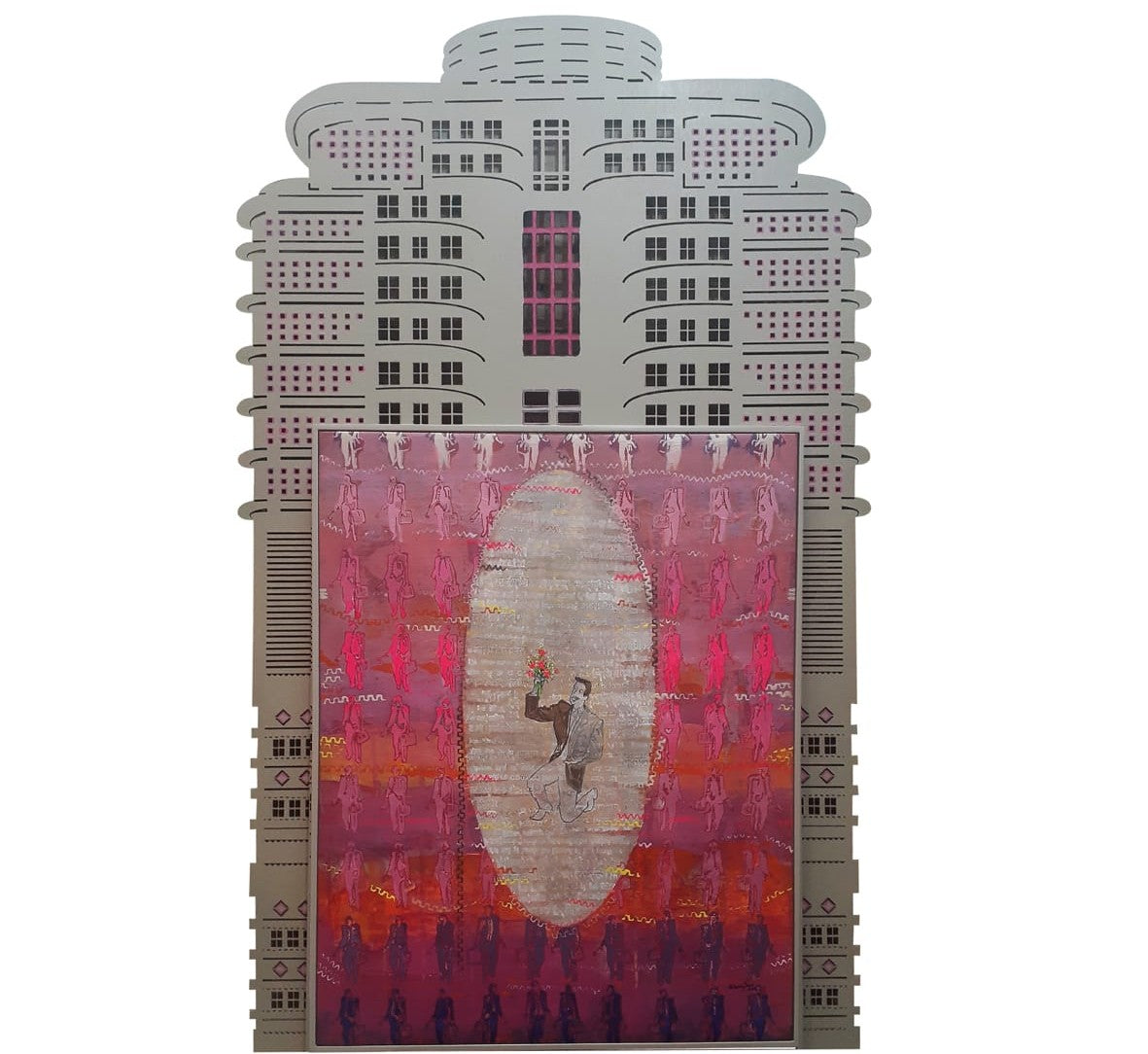 The artist’s innovative use of acrylic on canvas is complemented by an intricately crafted laser-cut board frame that elevates the work into a multidimensional experience. This architectural frame, designed with repeating geometric patterns reminiscent of a tall building or tower, features rows of cut-out windows and decorative dot motifs, lending the piece a distinctly urban texture. The precision of the laser-cut lines and shapes creates a rhythmic architectural language, amplifying the visual tension between the organic softness of the central figure and the structural rigidity of its enclosure.