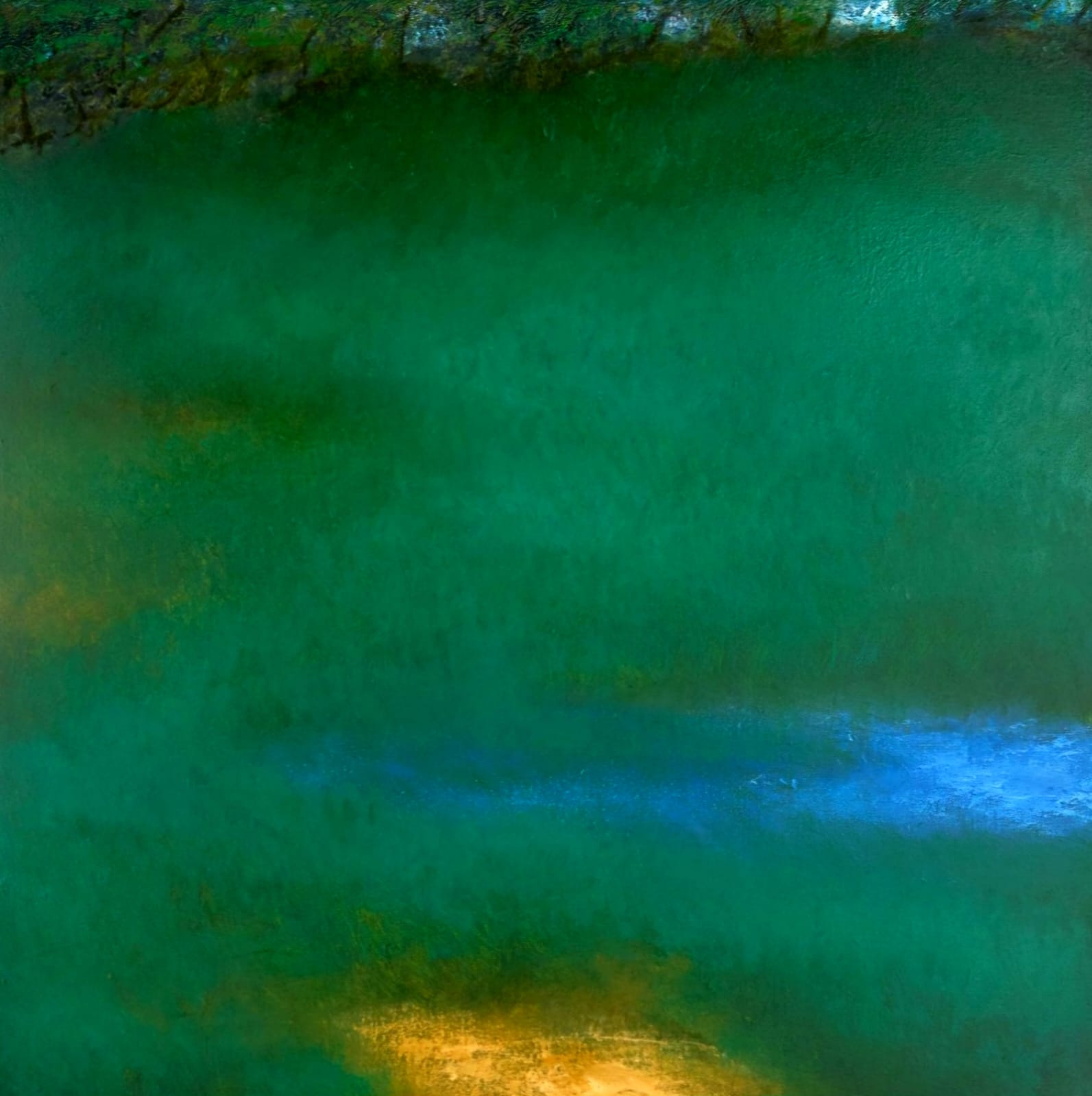 Hints of yellowish-green streak through the surface, their lighter tones creating gentle undulations that suggest light filtering through foliage or glinting off a forested pond. The addition of pale blue tones, especially a thin, slightly angled horizontal line, introduces movement and subtle directionality, hinting at a horizon, a reflection, or a fading stream. These strokes are neither assertive nor illustrative; instead, they gesture quietly toward possibilities within the abstraction.