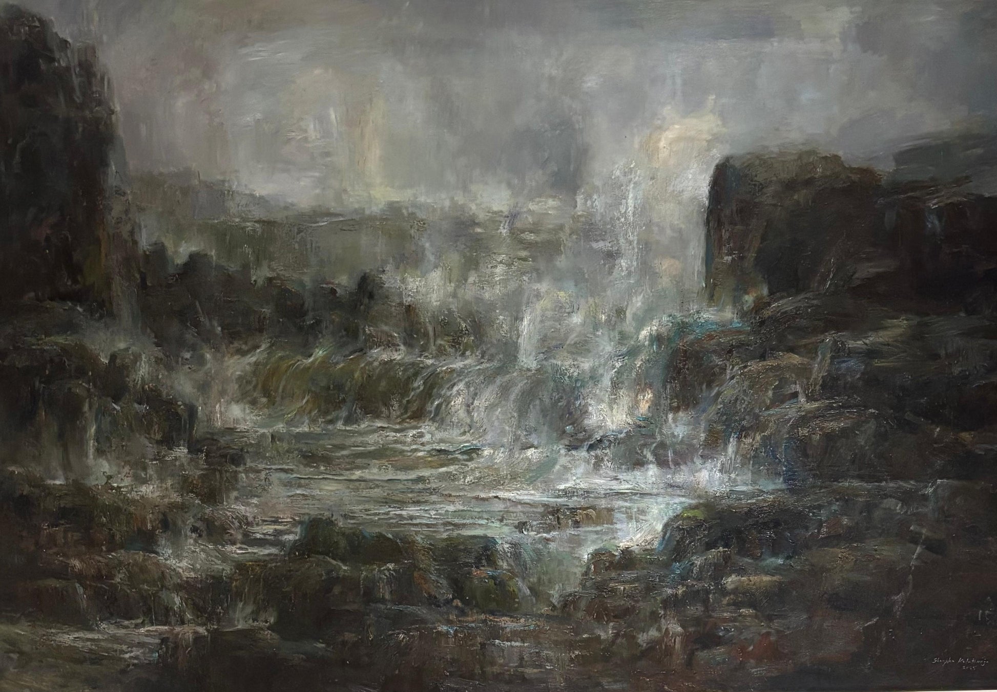 Water surges through this rocky terrain with restless energy, cascading down ledges and swirling around the stone outcrops in sinuous, forceful movement. The turbulent waves and splashes are painted with a dynamic gesturalism, capturing not just the physicality of water, but its emotional resonance. The sea is not simply present, it is active, animate, and unrelenting, playing the role of both destroyer and sculptor of the coast it embraces. A soft veil of mist hangs in the air, subtly muting the scene and infusing it with a brooding, ethereal quality. This diffused atmospheric effect speaks to the romantic tradition of landscape painting, where nature is rendered as both beautiful and unknowable, inviting reflection on the sublime. The absence of human presence only deepens the contemplative mood, allowing the viewer to become the solitary observer in a realm untouched by civilization.
