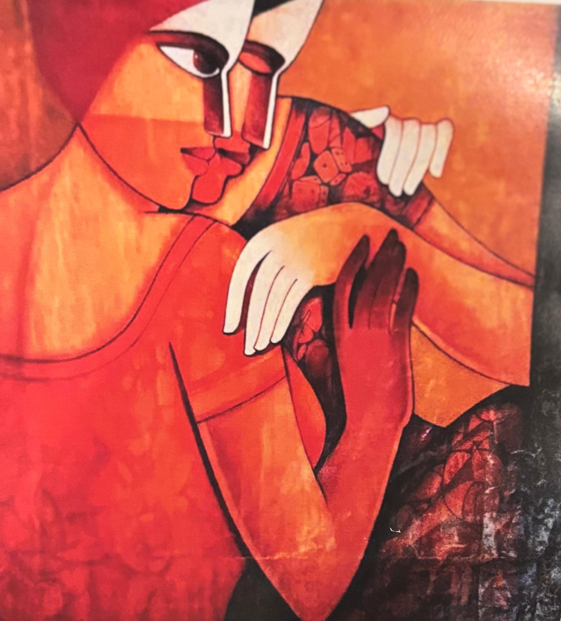 The faces of the women are stylized, defined by pronounced features and flat areas of pigment, suggesting a fusion of cubist influence with folk-inspired portraiture. Despite the abstraction, their expressions convey a sense of calm and understanding, a silent, shared experience between them. Their hands, rendered as substantial, expressive shapes, further emphasize their bond. Whether resting on one another or simply placed in proximity, the hands are symbolic anchors in the composition, speaking to trust, connection, and shared presence. Kishore’s use of texture and color is central to the work’s emotional power. The surface is alive with painterly energy, yet each stroke feels purposeful. The warm, earthen tones that dominate the piece evoke both the strength and softness associated with feminine energy, while the interplay of light and shadow adds dimensionality and mood.