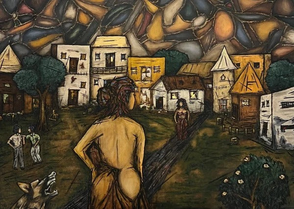 Rendered in a naïve, folk-art idiom, this evocative village scene by Anurag Anand captures the quiet rhythms of rural life with both textured detail and emotional clarity. At the heart of the composition is a gently winding path that draws the viewer inward, toward a solitary female figure who stands in still reflection. Surrounding her, the scene comes alive with understated narrative: children playing, a barking dog, and homes nestled within a landscape shaped by memory as much as observation. The painting’s expressive sky and warm, earthy palette, rich in hues of red earth, sun-faded ochres, and deep blue-greys, imbue the work with a nostalgic glow. These colors, signature to Anurag’s practice, recall monsoon skies and late-summer dusk, anchoring the piece in both time and place. The brushwork is intentionally unpolished, retaining the charm and raw energy of folk expression, yet the emotional layers beneath the surface suggest a mature and introspective vision.
