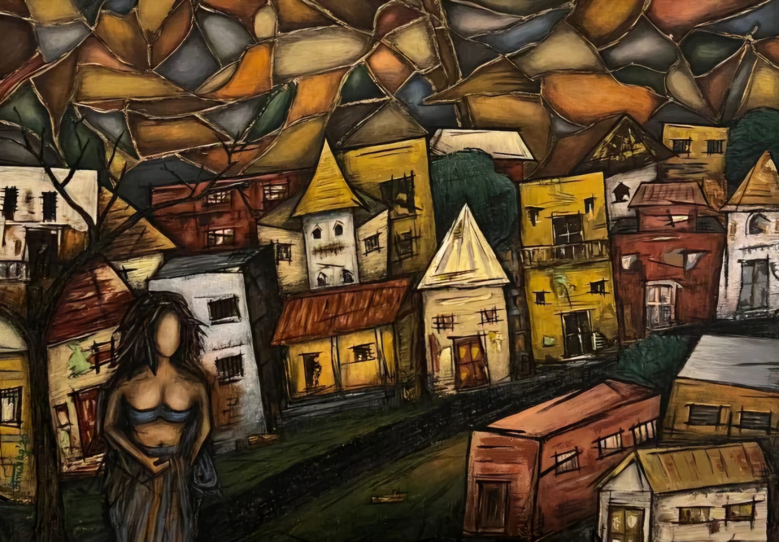 In In The Clearing, Anurag Anand presents a poignant and visually arresting scene, a solitary, faceless woman standing amidst a fragmented urban backdrop. The composition is a dense patchwork of tilted homes and fractured, stained-glass skies. While the architecture looms expressively, bordering on the surreal, the woman's stillness creates a powerful contrast. Her facelessness evokes a sense of anonymity and vulnerability, speaking to the emotional alienation often experienced in chaotic, modern environments. This duality, between movement and stillness, turmoil and introspection, is central to Anurag Anand’s artistic process. Many of his works begin in an expressive, almost chaotic emotional register and gradually resolve into visual calm. That trajectory, from unrest to inner balance, is not only visible on the canvas but also felt by the viewer as a deeply personal emotional cadence. In The Clearing captures this transformation eloquently, offering a moment of quiet reflection amidst visual disorder.