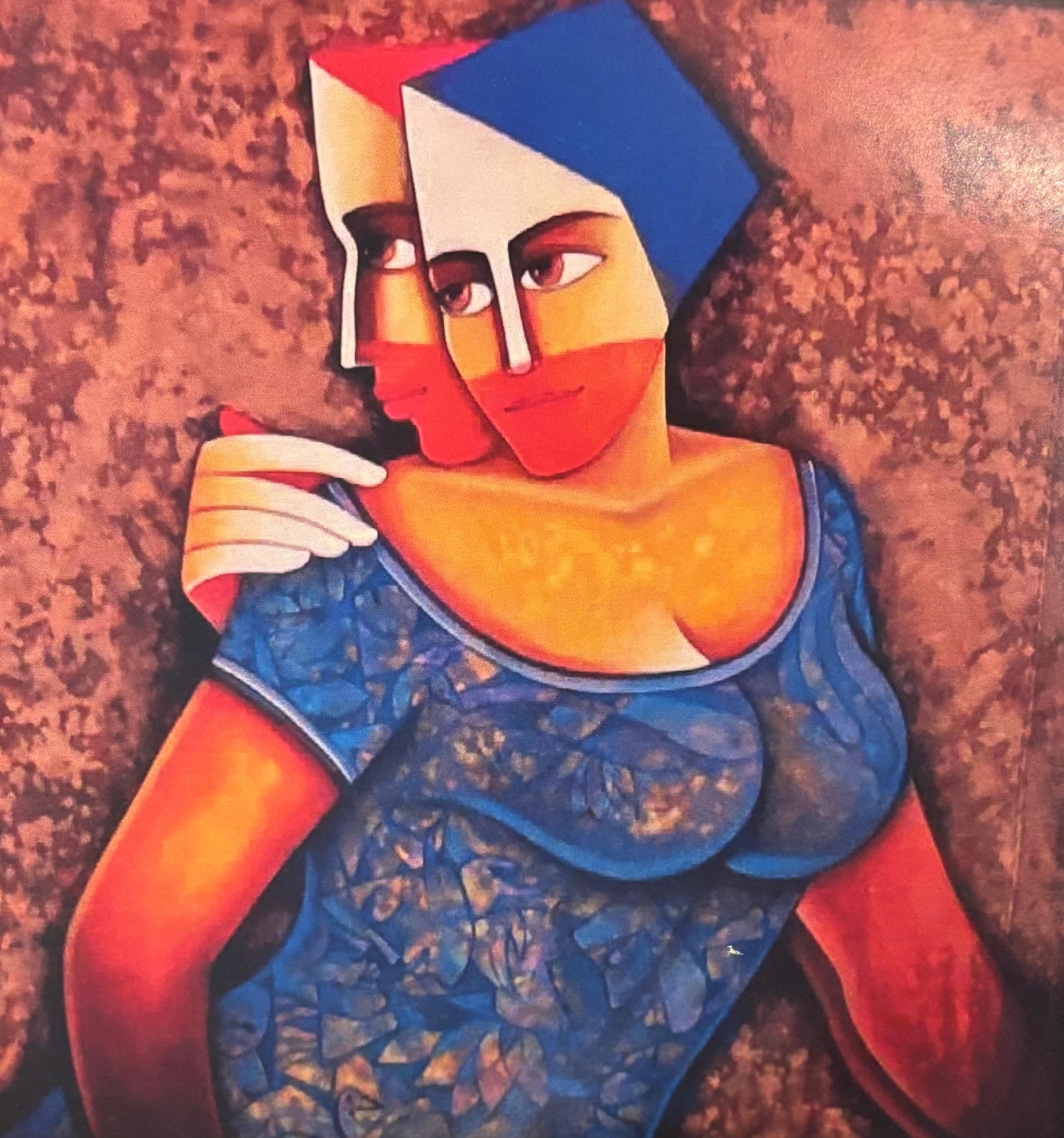 Her attire, a textured blue dress with intricate patterns, adds richness and depth to the composition. The brushstrokes here are deliberate, enhancing the impression of woven fabric and grounding the figure in both physical presence and symbolic meaning. The arms and shoulders, painted in luminous tones of orange and reddish-brown, extend the warmth of the red facial half and suggest a life force pulsing through the body. The background is equally significant. A warm, brownish-gold field with a mottled, layered texture envelops the subject in an aura of timelessness. It provides a serene yet glowing contrast to the bold figure, allowing the colors of the woman to emerge vibrantly while reinforcing the emotional and spiritual themes of the piece. Executed in acrylic on canvas, The Divine Love is both contemporary in technique and timeless in theme. The geometric stylization, textured surfaces, and contrasting color theory evoke influences of modernist abstraction and Indian folk expression, yet the result is entirely Kishore’s own.