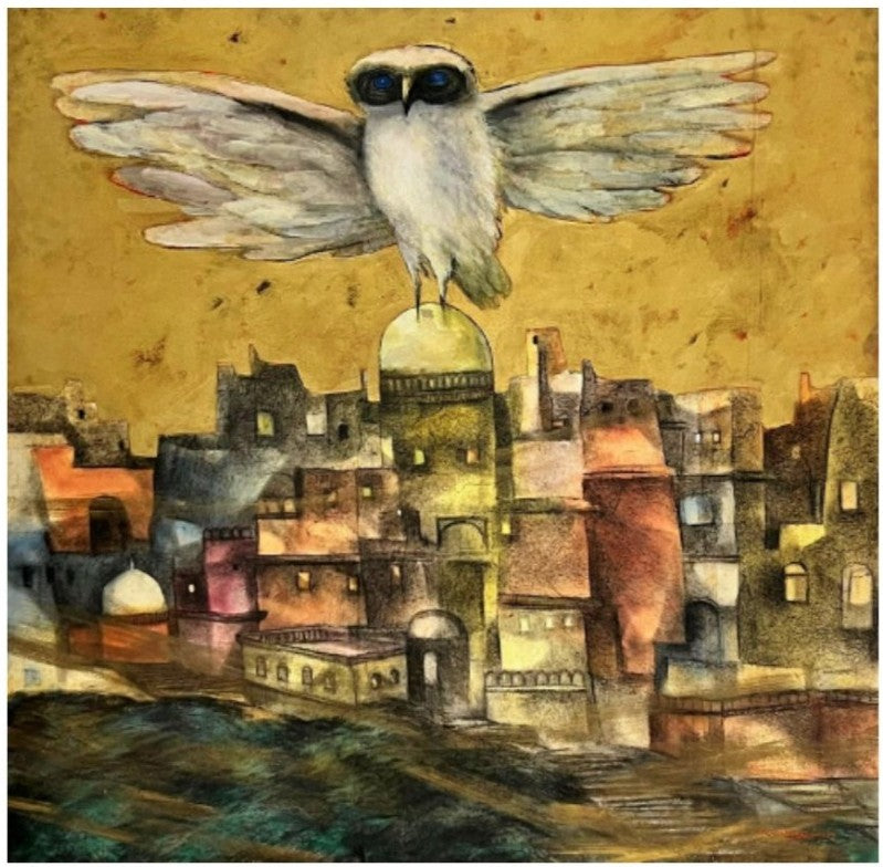 In the mid-ground, the architectural rhythm intensifies. Among the clustered structures, one building stands out, a taller edifice crowned with a light golden-yellow dome, drawing the viewer’s eye upward. This deliberate focal point further emphasizes the interplay between earthly existence and spiritual symbolism. The owl dominates the upper half of the painting, its wings fully outstretched in a graceful arc, as if suspended between realms. Its gaze seems omniscient, offering both protection and introspection. The bird’s presence transforms the city below from a mere collection of buildings into a living entity watched over by silent sentinels of history and memory.