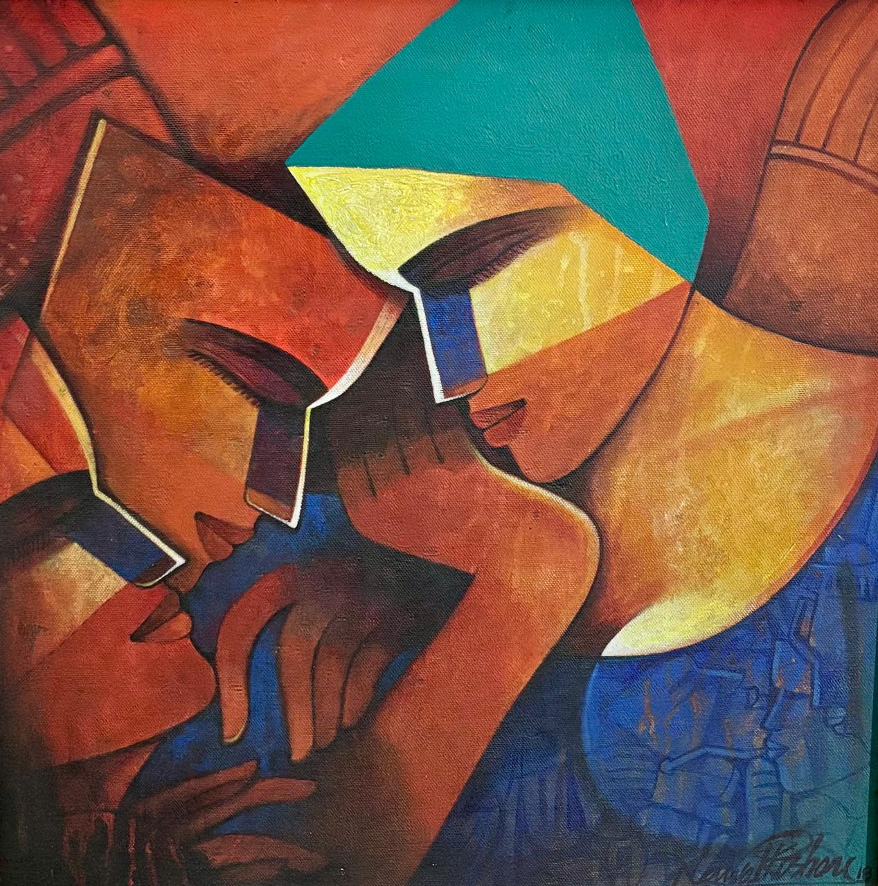 This compelling abstract painting offers an intimate portrayal of two women, rendered through a stylized and geometric lens. The figures’ faces and bodies merge and overlap, creating a visual representation of closeness, connection, and shared experience. The blending of forms evokes a sense of intimacy that transcends literal depiction, inviting viewers to engage with the emotional resonance between the figures.