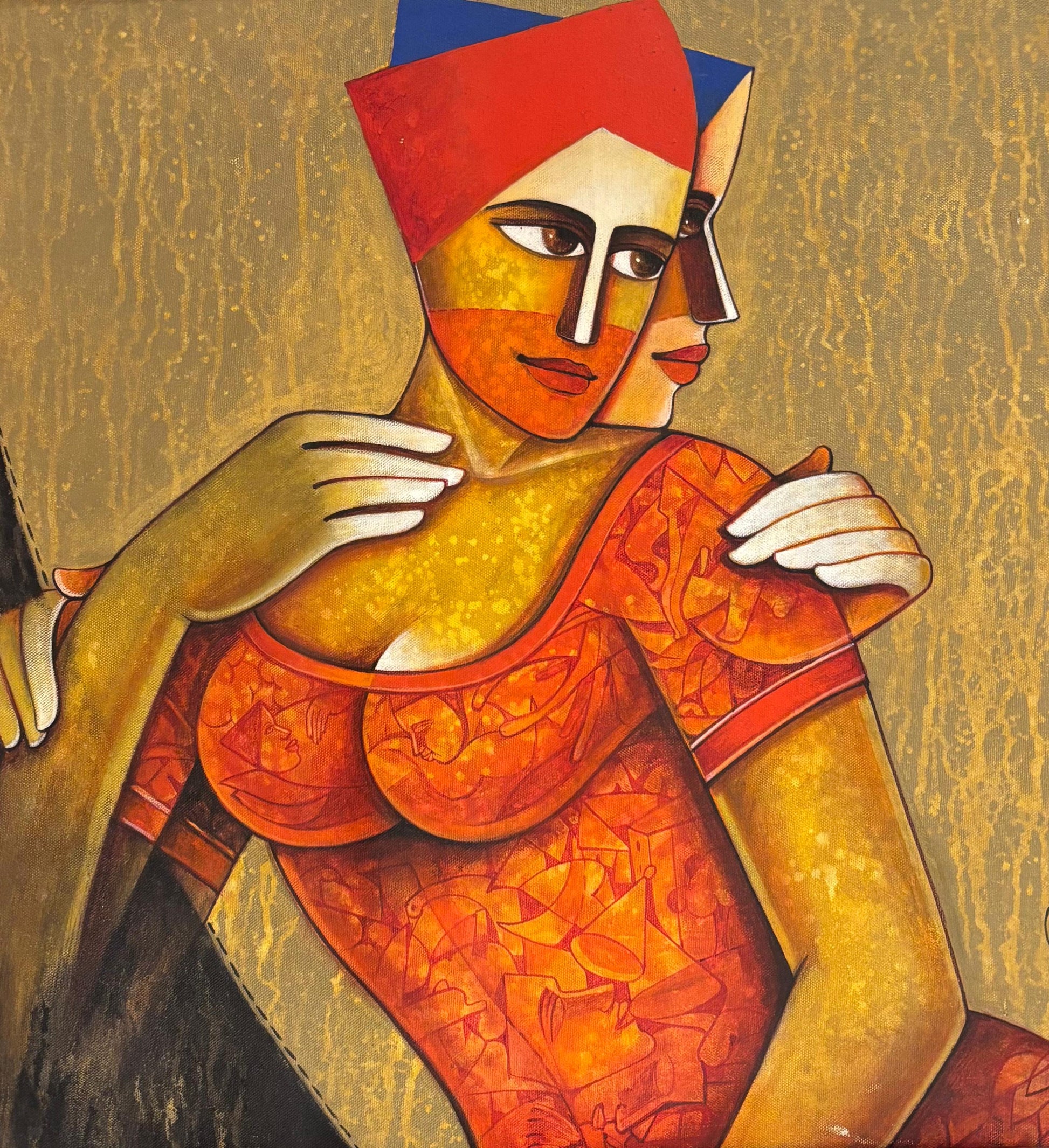 Clad in traditional Indian garments or attire inspired by similar cultural dress, the figures’ clothing is adorned with intricate stylized patterns. These patterns provide a rhythmic visual texture, contributing to the overall harmony of the piece. The use of pattern and color invites reflection on cultural identity and heritage as integral components of the figures’ relationship. The background features a textured golden-beige tone, applied with visible brushstrokes that create a subtle sense of depth and dimensionality. This nuanced backdrop acts as a calm and grounding space that contrasts with and highlights the vivid figures at the painting’s center.