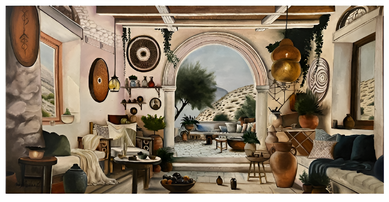 M. Shakeel’s work deftly channels Mediterranean and Greek Revival architectural influences, while emphasizing warmth, relaxation, and contemplative stillness. The painting stands as a celebration of light, texture, and thoughtful design, inviting viewers to immerse themselves in a moment of serene beauty and quiet repose.