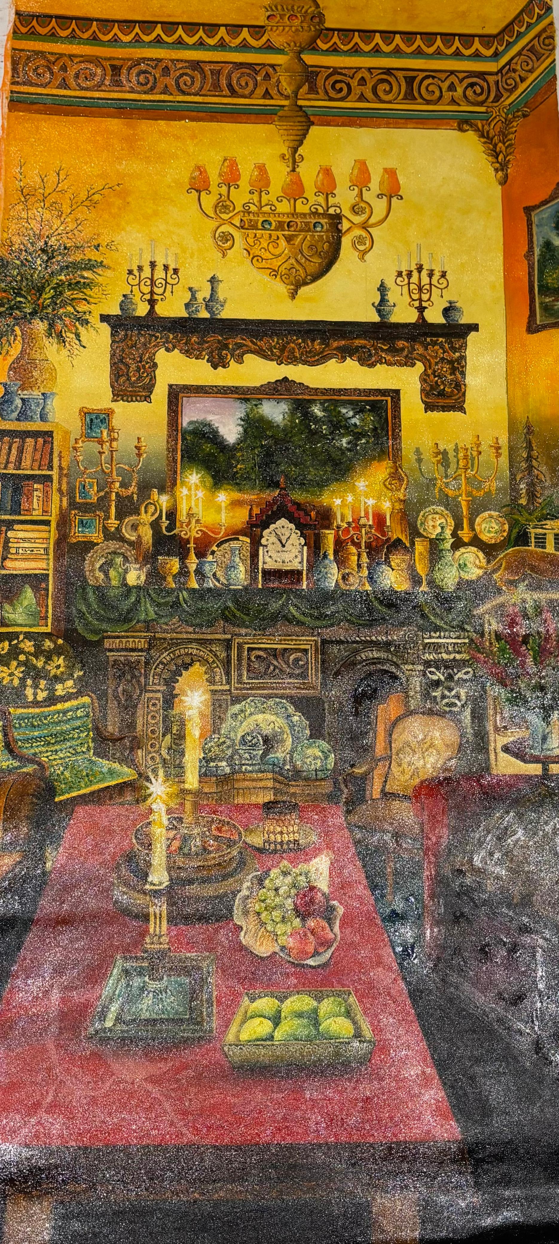 In the foreground, a table laden with bowls and baskets overflowing with fresh fruit adds a tactile and sensory dimension to the room. Surrounding chairs and plush furniture complete the setting, suggesting a space designed for comfort, conversation, and social gathering. Shakeel’s masterful brushwork and textured paint application imbue the scene with a painterly quality that balances realism with expressive depth. The surface reveals subtle variations in light and shadow, enhancing the three-dimensionality of the objects and architectural features. This attention to detail not only celebrates the craftsmanship of the room itself but also the artist’s dedication to capturing the nuances of light, texture, and materiality. A celebration of historical elegance and an intimate study of interior space. Through this richly layered work, M. Shakeel invites viewers to step into a world of luxury, tradition, and quiet sophistication, a timeless tableau of beauty and refinement.