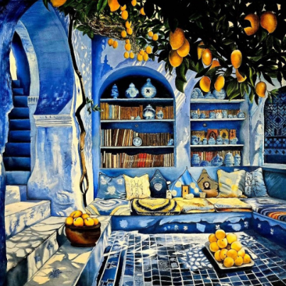 This composition invites the viewer into a serene Mediterranean-inspired interior, where the gentle interplay of natural light and thoughtful design evokes a tranquil, almost poetic atmosphere. The dominant blue hues create a calming foundation, their coolness balanced by the warm glow of sunlight filtering through, illuminating the space with an inviting radiance. This nuanced treatment of light and color transforms the scene into a sanctuary of quietude and comfort, where architecture and nature seamlessly converge.