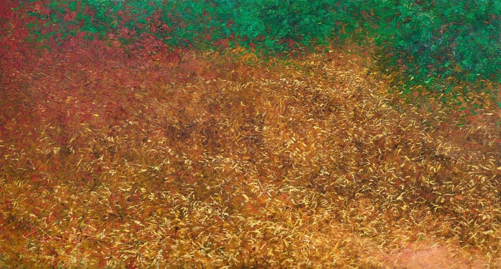 This untitled painting by Paramjit Singh presents a textured, abstracted landscape, rendered with his signature sensitivity to color, light, and form. A close-up view reveals an intricately worked surface, evoking the quiet richness of nature through subtle transitions and a layered painterly language. Singh, known for his deeply meditative and immersive landscapes, transforms the canvas into a space of both introspection and sensory engagement. The composition unfolds in a gradual transition of warm hues, beginning at the top with deep reds and rust-like oranges that suggest a fading horizon or the remnants of a glowing sky. As the viewer’s gaze moves downward, these tones soften and merge into a radiant field of golden oranges, earthy browns, and sunlit bronze. The transitions between these tones are seamless and atmospheric, lending the work a dreamlike quality that captures the passage of time or light over a field at dusk or dawn.