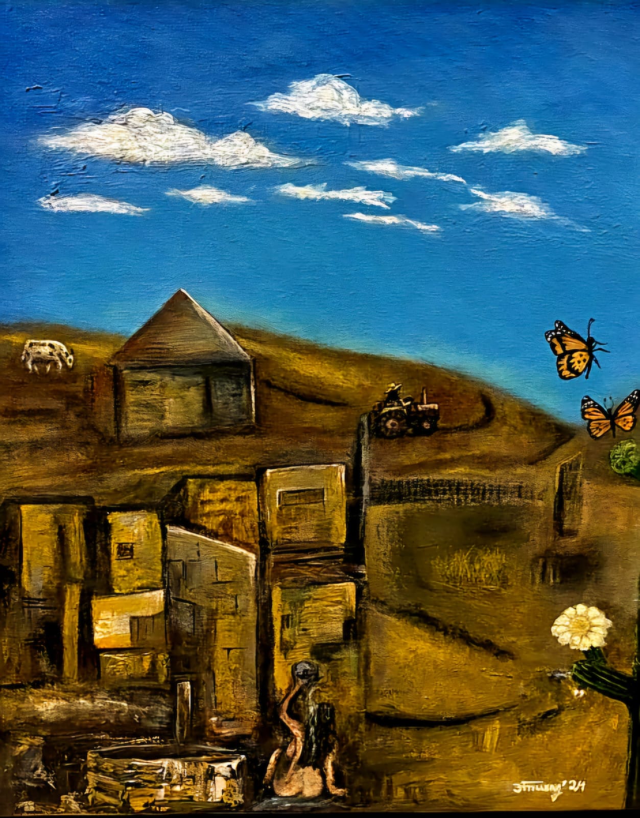 Adding layers of symbolic and environmental richness, monarch butterflies flutter throughout the scene, their vibrant orange wings symbolizing transformation and migration. Desert flora dot the landscape, grounding the painting firmly in its ecological context and emphasizing the delicate balance between human habitation and the natural world. The artist’s use of texture and nuanced color variation gives the painting a tactile quality, inviting viewers to engage not only visually but emotionally with the scene. Each element, the weathered buildings, the reflective water, the figures and animals, works together to create a narrative of continuity, resilience, and harmony.