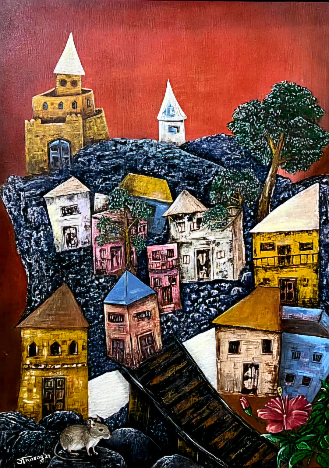 Among the many details, a small light tan-gray mouse resting on a rock in the foreground draws special attention. Humble yet symbolic, the creature enriches the narrative with intimacy and invites reflection on coexistence between humans, animals, and the divine. Anand’s placement of this figure subtly reinforces Ganesha’s presence while grounding the work in lived reality.