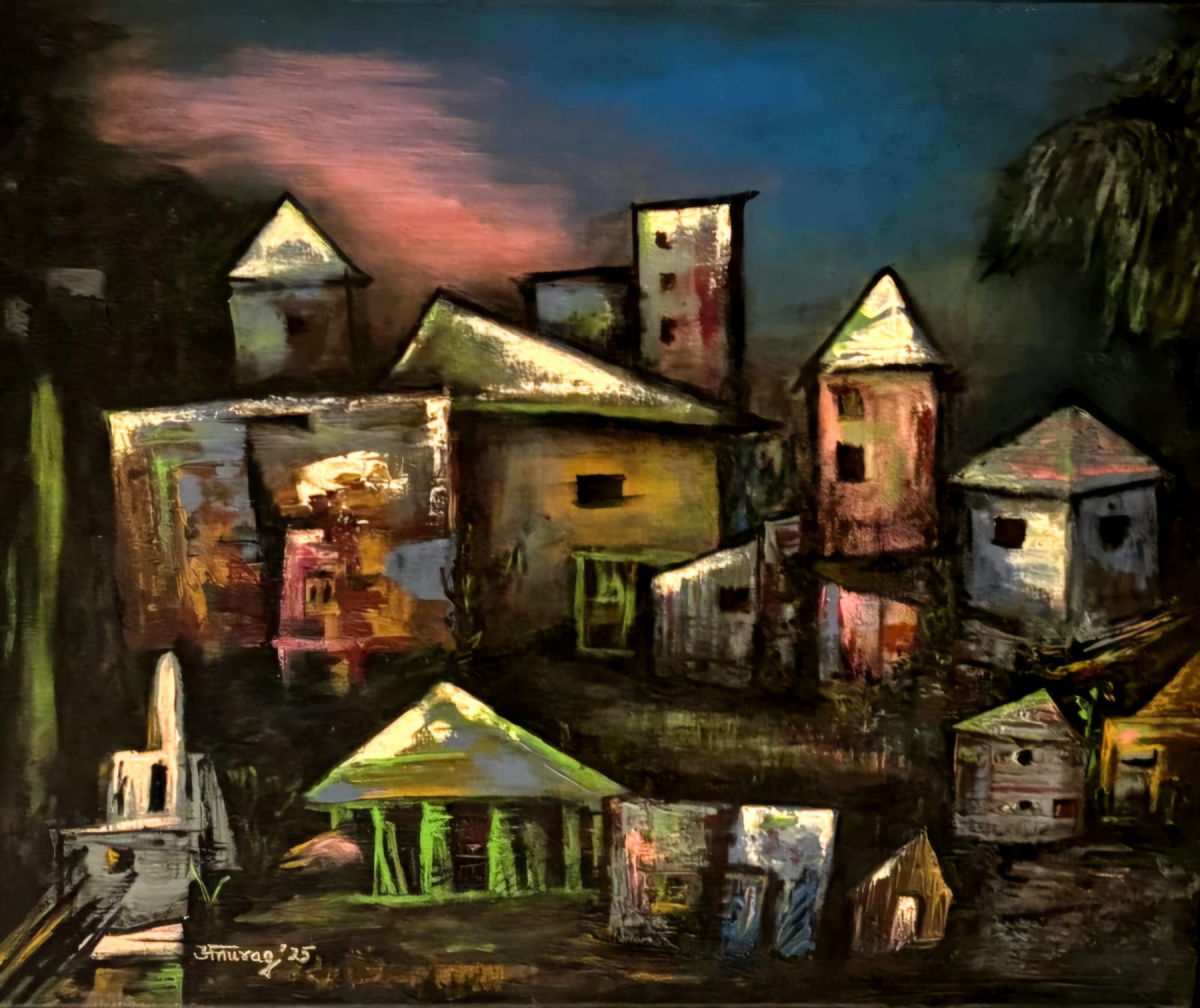 The palette is both muted and evocative, blending earthy grays, browns, and ochres with soft washes of pink, lavender, dusty yellow, and pale blue. These color choices evoke the fleeting, introspective mood of early morning or evening light, moments when the world seems to pause between action and rest. The delicate modulation of tone and hue enhances the emotional undercurrent of the piece, inviting viewers into a dreamlike space where past and present coexist. Bold, expressive brushstrokes animate the surface, giving the architectural forms a textured, tactile quality. The buildings, while abstracted, retain a sense of weight and density. They cluster tightly together, suggesting both community and enclosure, as if shaped by the rhythms of daily life and collective memory. The contrast between angular structures and softer color gradients establishes a gentle visual tension, reinforcing the duality between the built environment and surrounding atmosphere. Hints of foliage at the edges and distant shifts in color on the horizon suggest natural elements and spatial recession. These subtle cues draw the eye beyond the foreground, opening the composition into a wider, more contemplative field. The village seems not merely a physical location, but an emotional landscape, alive with memory, rooted in place, yet reaching into something timeless and intangible.