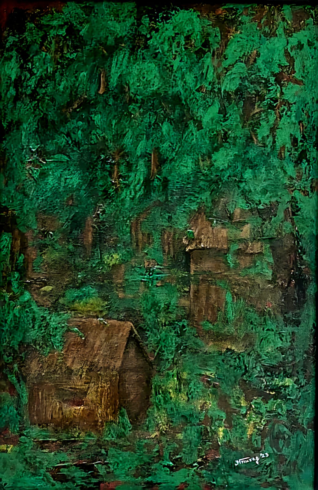 The hut, with its earthen tones and simple structure, rests gently within this vibrant wilderness. It does not dominate the landscape, but rather integrates into it, symbolizing both refuge and humility. Its presence suggests a life lived in balance with nature, rooted in simplicity, resilience, and solitude. The palette used for the hut mirrors the hues of its surroundings, reinforcing the theme of harmony between human life and the natural world. Color and texture serve as the primary language in this work. Verdant greens, deep umbers, and golden highlights intermingle to evoke the play of light filtering through dense leaves. The absence of human figures enhances the meditative quality of the scene, encouraging the viewer to project themselves into this tranquil space, to pause and reflect.