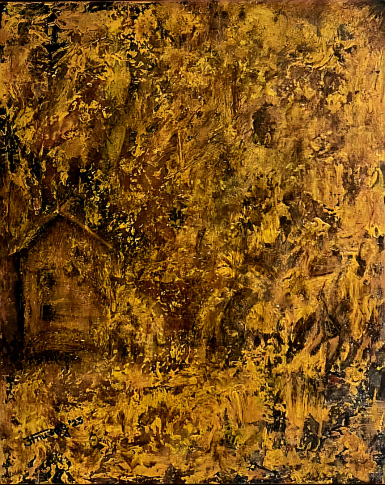 The tonal contrast between light and dark areas introduces spatial complexity and visual movement. Golden highlights suggest filtered sunlight, while deeper, shadowed sections recall forest undergrowth or the cool quiet of dusk. This dynamic play between shadow and illumination generates a visual rhythm that invites quiet reflection, making the painting not just an object to be viewed, but a space to be entered emotionally. This work stands at the intersection of abstraction and landscape. It echoes the expressive materiality of modernist abstraction while remaining deeply rooted in a sense of place. Rather than offering a direct representation, the artist conjures a landscape of feeling, one built from texture, memory, and the enduring relationship between humans and the earth.