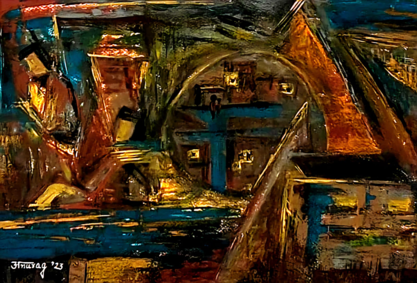 This powerful abstract, expressionistic cityscape immerses viewers in an urban environment shaped by emotion, memory, and movement. The artist masterfully composes a dynamic visual field through bold, gestural brushstrokes and a richly saturated palette of dark browns, rusty oranges, burnt reds, deep teals, and shimmering gold accents. These tones conjure the energy and warmth of aged architecture, evening city lights, and lived-in spaces, grounding the painting in a deeply felt sense of place.