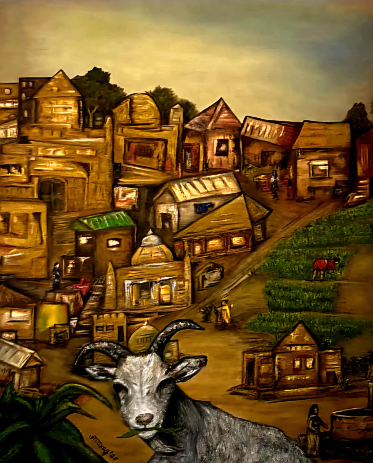 A goat, prominently placed in the foreground, anchors the composition with pastoral charm. Its presence adds life to the setting, reinforcing the painting’s grounding in agrarian reality. This animal, often a symbol of sustenance and resilience, serves as a gentle reminder of the interconnectedness between human life and nature in village ecosystems. The artist’s use of textured brushwork gives the surface a tactile richness, imbuing the canvas with a sense of material depth and lived-in warmth. Each stroke seems to hold the weight of memory and continuity, reflecting the physical and emotional layers of rural life. This technique enhances the authenticity of the work, allowing the viewer to not just see but feel the environment portrayed.