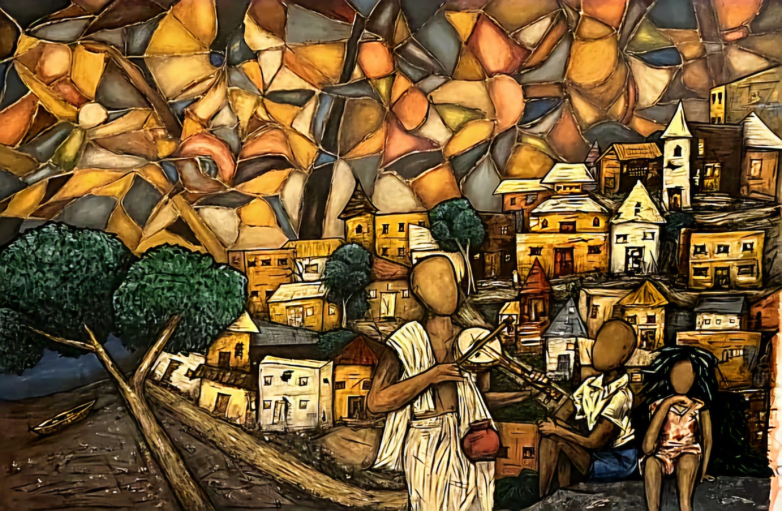 Dark green stylized trees punctuate the composition, providing visual anchors against the richly patterned background. Their prominence contributes to the overall balance and helps frame the village within its natural environment. A small boat situated in the lower left corner adds another narrative element, symbolizing livelihood, travel, or connection to water as a life source. Anand’s mosaic style approach transforms this village scene into a complex tapestry of color, texture, and symbolism. The layered brushwork and rich palette work in tandem to create an immersive, almost tactile experience that celebrates both the individuality of the elements and their integration into a unified whole.