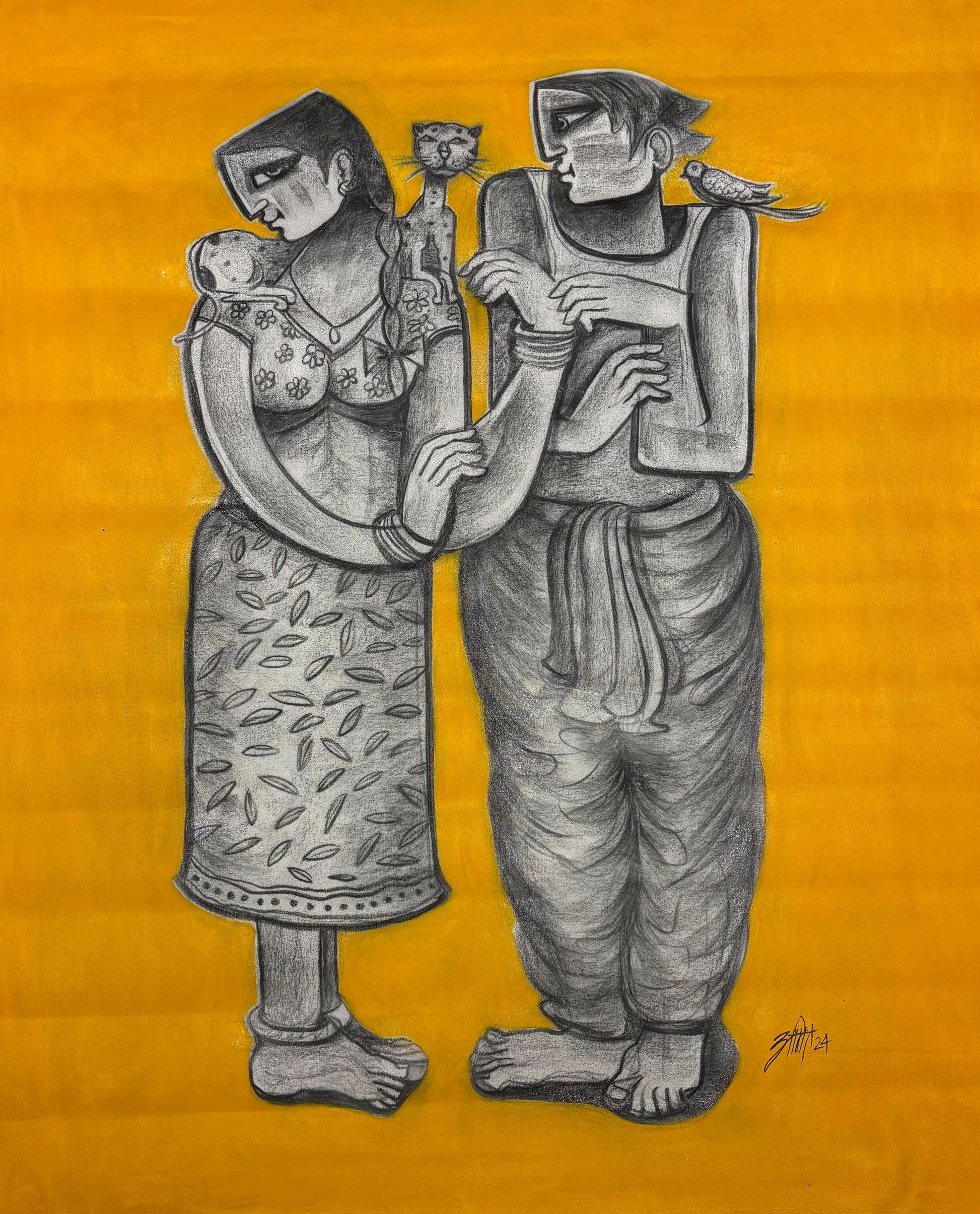 In this evocative untitled work by Amit Rajvanshi, the artist blends intimate human connection with folk-inspired visual storytelling. The composition features a grayscale drawing, likely rendered in graphite or charcoal, that is set strikingly against a rich mustard-yellow background. This vivid contrast of monochrome figures against a saturated field evokes a sense of both immediacy and timelessness, drawing the viewer into a quiet, yet emotionally resonant narrative.