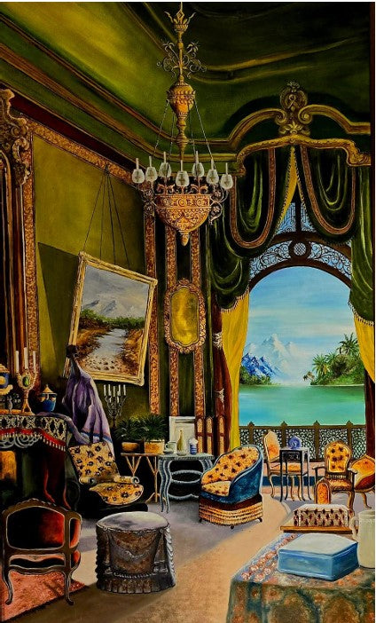 In this evocative oil painting, M. Shakeel renders a meticulously composed interior that seamlessly merges opulence, nostalgia, and narrative suggestion. Rich in period detail, the work invites viewers into a lavishly appointed room, where every element, from gilded moldings to velvet drapery, has been orchestrated to conjure a sense of cultivated grandeur. With its saturated palette, layered textures, and interplay of interior and exterior vistas, the painting functions as both a visual archive and an atmospheric meditation on memory and place.
