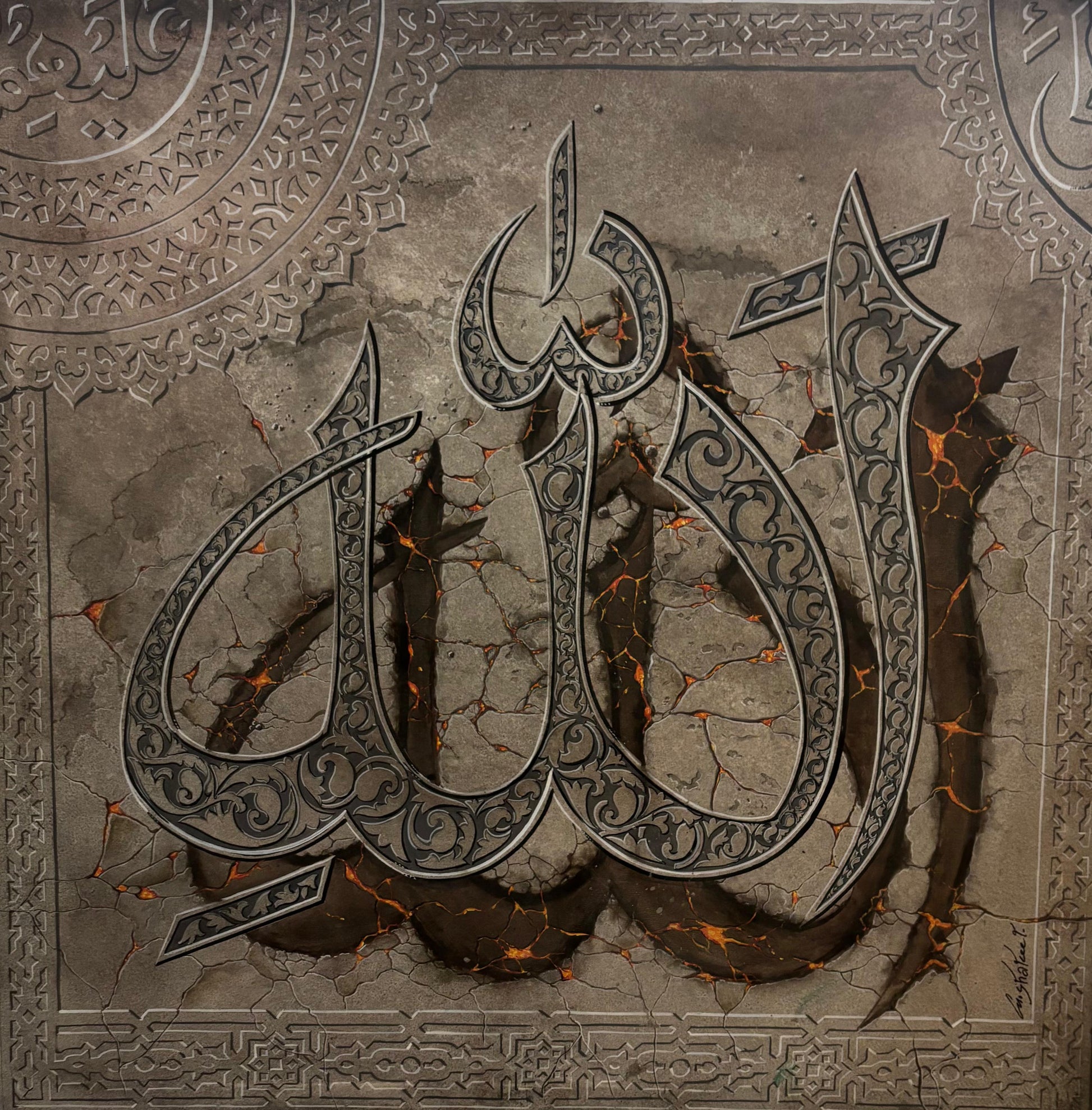 The composition is deeply rooted in Islamic artistic heritage, drawing from centuries of ornamental calligraphy, where script transcends function to become a sacred visual art. Shakeel’s interpretation situates the divine name within a weathered stone surface, rendered in muted grayish-brown hues. The stone itself bears the passage of time: cracks and craquelure ripple across the canvas, suggesting both historical endurance and spiritual resilience. This visual aging effect is intensified by a reddish-orange wash that appears to emanate from beneath the surface, subtle and evocative, it lends the piece an otherworldly luminosity, as though divine light burns beneath the material world.