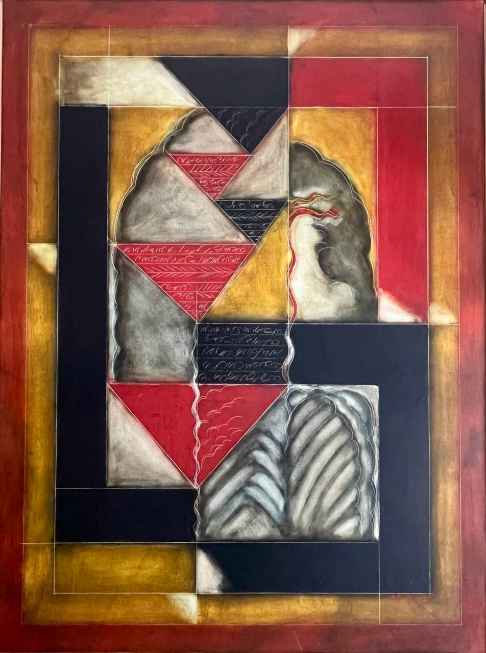 This large abstract painting by Akkitham Narayanan is a masterful composition that fuses geometric rigor with symbolic depth. Executed in oil on linen, the work is distinguished by its bold architectural structure and richly layered surface, offering a contemplative visual experience that straddles the realms of abstraction, symbolism, and cultural resonance. The canvas is organized into an intricate grid of geometric shapes, primarily squares and triangles, arranged in a rhythmically interlocking pattern. These forms are not merely decorative, they serve as the foundational structure for Narayanan’s exploration of balance, duality, and spiritual symbolism. The color palette is warm and grounded, dominated by rich reds, golds, muted yellows, and dark grayish-blacks. The reds and golds radiate energy and vitality, while the darker tones anchor the composition, creating a dynamic yet harmonious equilibrium.