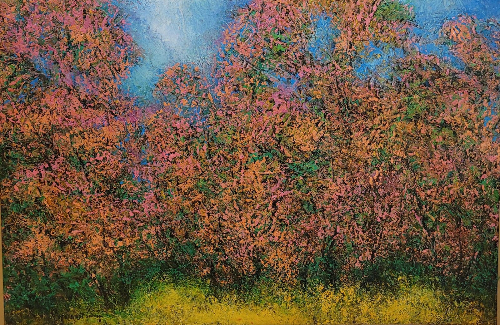 The interplay of colors creates a tapestry of energy, evoking the richness of autumn while also pushing the work toward abstraction. Each stroke contributes to a sense of movement, as if the forest itself is alive and shifting. The dense clustering of trees fills the mid-ground and background, producing depth while simultaneously flattening into rhythmic patterns that echo Singh’s longstanding engagement with abstraction. Anchoring the scene is a luminous strip of yellow-green undergrowth across the foreground. This band of color introduces a grounding element, while also heightening the vibrancy of the palette. Above, glimpses of pale blue sky filter through the treetops, offering moments of calm and openness within the otherwise saturated and layered forest. The overall effect is both immersive and contemplative, an invitation for the viewer to enter a space where color and atmosphere merge into a singular poetic experience.