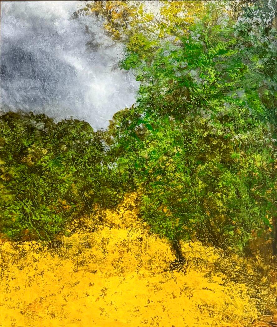 Beneath this forested canopy, the lower half of the painting opens into a field of radiant golden yellow. This expansive plane of color is rich in texture, its rough, tactile surface contrasting with the softer blending of greens above. The golden ground anchors the composition while simultaneously evoking the fertile presence of earth, grass, or cultivated land. Singh achieves a seamless transition between the green and gold zones, allowing them to merge organically in a manner that recalls the shifting layers of memory or the dissolving edges of perception. Although abstract in execution, the painting resonates with the imagery of landscape, trees, sky, and ground, yet refuses to bind itself to literal representation. Instead, Singh privileges atmosphere, color, and mood, constructing a visual language that conveys nature’s spirit rather than its outward appearance. This emphasis on essence over detail reflects his lifelong exploration of landscape as a site of inner reflection and quiet transcendence.