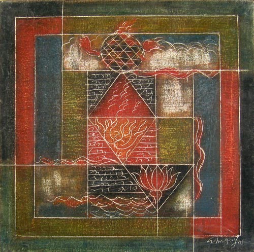 The composition is carefully orchestrated around geometric forms – squares, triangles, and rectangles – which are meticulously layered and intersected by fine white lines. These lines create a sense of spatial rhythm and mathematical precision, evoking the mandala, a sacred diagram used in Hindu and Buddhist practices to represent the universe. The central triangular motif, with its fiery, almost alchemical symbolism, draws the viewer’s eye inward, suggesting transformation and inner energy. Surrounding this are other symbolic elements: flowing wave patterns, script-like markings, cloud forms, and a lotus motif. These details provide a rich narrative depth while maintaining an abstract aesthetic that resists literal interpretation.