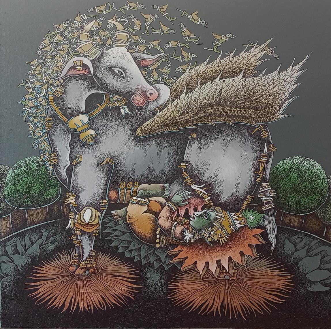 This painting presents a sophisticated interplay between the natural and the artificial, merging organic life forms with mechanical and symbolic motifs to evoke a sense of transformation and interconnectedness. The hybrid figure, part horse, part bovine, part mythical construct, serves as a central metaphor for evolution, hybridity, and the merging of human imagination with the forces of nature. The artist’s approach reflects a broader trend in modern and contemporary art where myth and fantasy become tools for reinterpreting ecological, spiritual, and cultural identities.