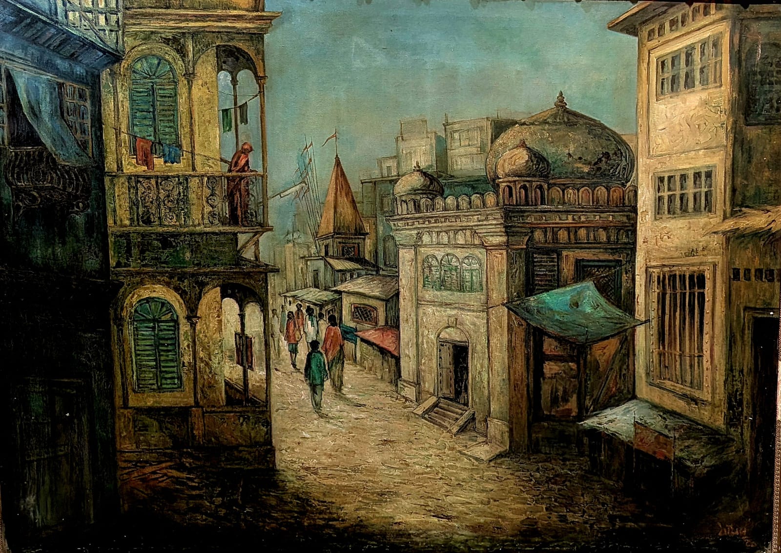 At the centre, slightly receding into depth, rises a domed structure adorned with arches and ornate carving, suggestive of a mosque, shrine, or historic communal space. Beside it stands a tall, triangular spire reminiscent of a temple. This juxtaposition evokes a neighbourhood shaped by cultural coexistence, where multiple faiths and histories breathe within a single cityscape. The street itself appears uneven, painted with rough strokes that make the cobbled or packed-earth surface feel worn, damp, and alive with use. A small cluster of figures walks through it, loosely rendered silhouettes of everyday life, whose anonymity allows the architecture and mood to dominate.