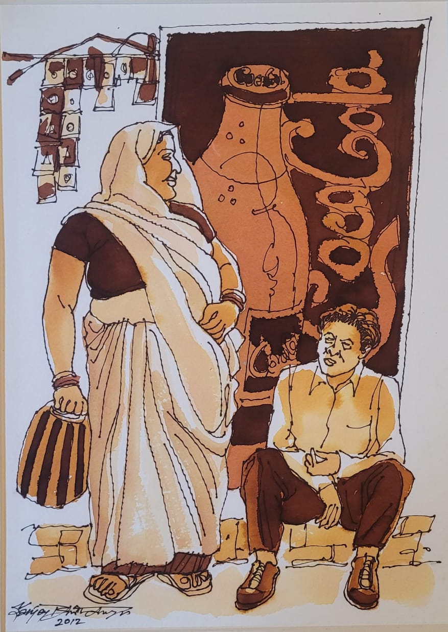 Bhattacharya’s watercolour technique enhances the emotional atmosphere. His mastery over washes allows daylight to glow softly across textures and surfaces, while his refined ink work defines form without rigidity. The palette, warm, earthy, inviting, evokes familiarity and belonging, grounding the scene in relatable human experience. His control of composition ensures that every element, from signage to figure placement, contributes to the narrative balance between humour and stillness.