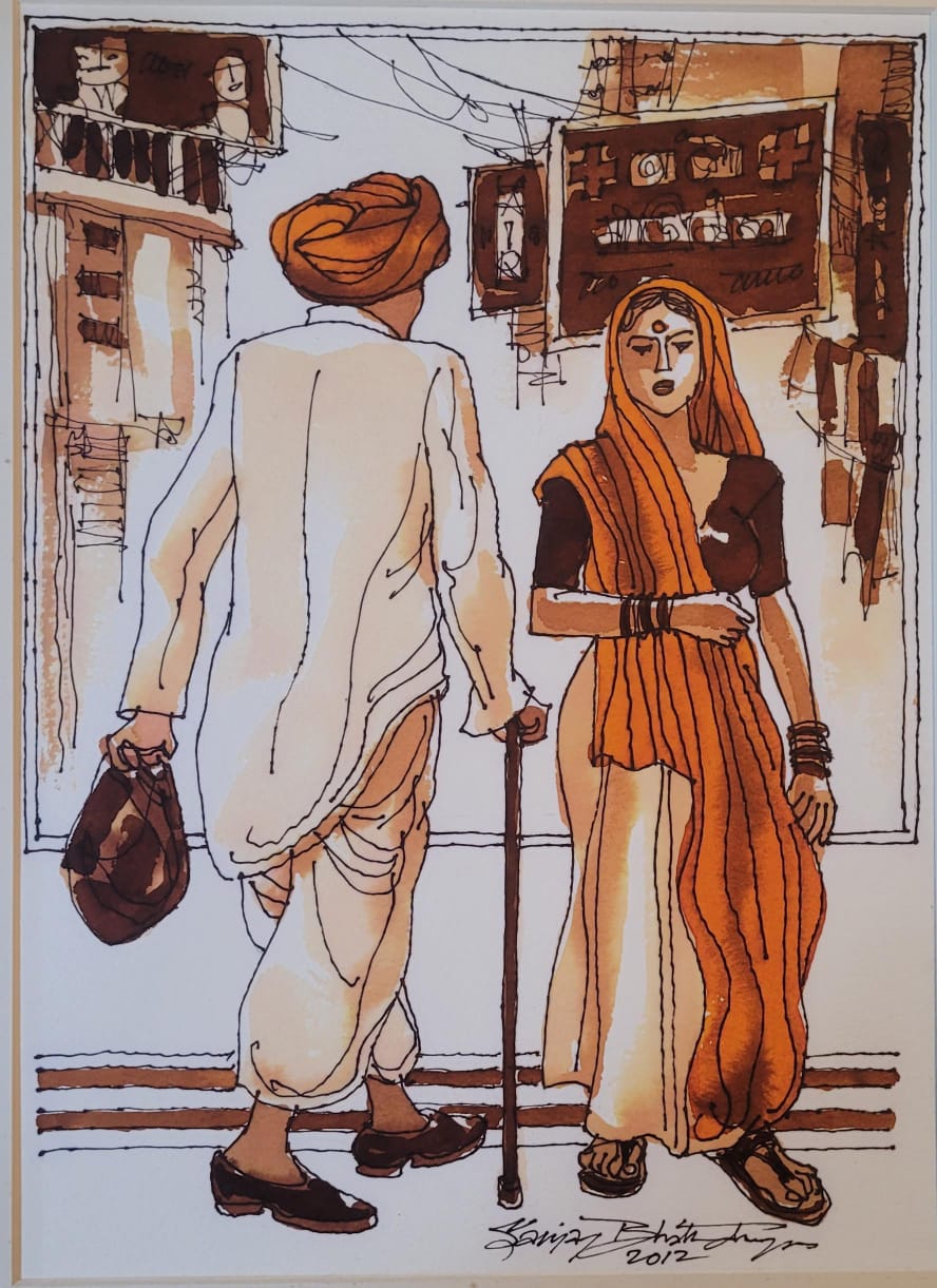 In this evocative work, Sanjay Bhattacharya captures a fleeting moment of everyday Indian life with his signature clarity and warmth. The composition brings together a poised woman draped in saffron hues and an elderly man mid-stride, their forms outlined in confident ink lines. Bhattacharya’s use of earthy washes and controlled detailing transforms an ordinary street scene into a subtle study of presence, distance, and human connection. The artwork reflects his gift for elevating the familiar, turning simple gestures, quiet glances, and lived environments into poetic visual narratives.