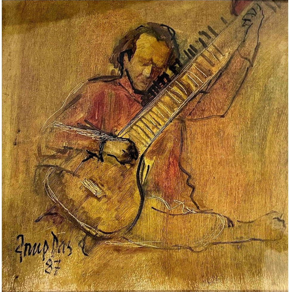 Rendered with a warm and evocative palette, this oil on canvas by Arup Das captures the intimate moment of a musician deeply engrossed in the art of sitar playing. The painting’s expressive brushwork and richly layered tones evoke both the physicality of the act and the meditative concentration that defines musical performance. Through an abstracted yet dynamic representation, Das invites viewers to experience the emotional resonance and cultural significance of this timeless instrument.