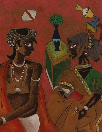 Radiating a refined elegance, A A Almelkar’s watercolor and gouache on paperboard exemplifies a harmonious synthesis of tradition and sophisticated artistry. The composition centers on poised figures, whose richly adorned attire and delicate embellishments convey an air of quiet dignity and cultural depth. Through a subtle yet deliberate interplay of form and ornamentation, the artwork invites viewers into an intimate narrative that transcends the spoken word, revealing a profound exchange imbued with grace and contemplation.
