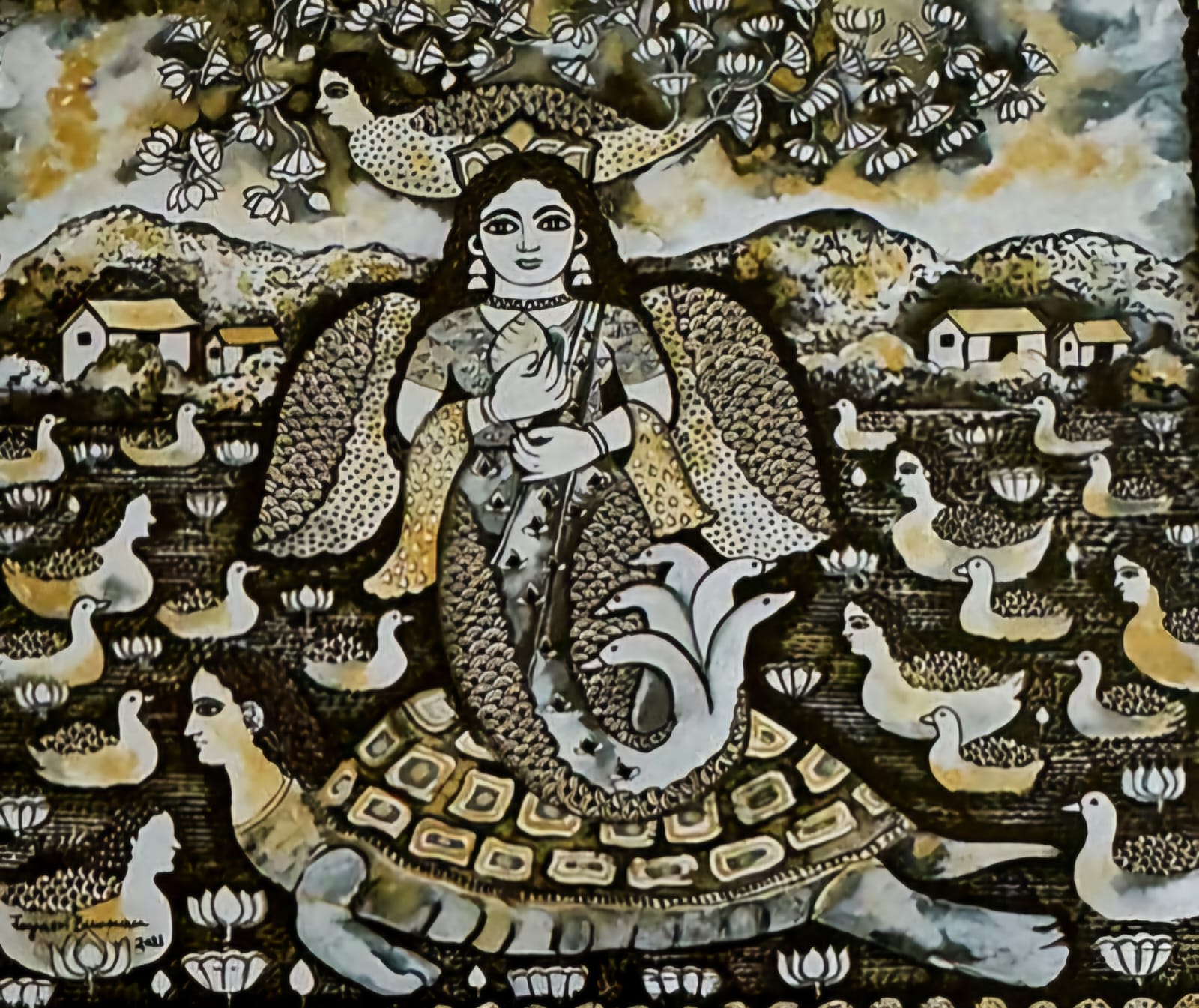 The entire painting is executed in a restrained yet elegant palette of black, white, muted golds, and soft beige tones. This monochromatic harmony enhances the ornate textures and emphasizes the painstaking detail of the artist’s linework and compositional symmetry. The repetition of patterns throughout, on the turtle’s shell, the goddess’s attire, and the natural elements, contributes to a hypnotic visual cadence, emblematic of sacred geometry and meditative art forms. Combining myth, symbolism, and folk aesthetics, this work invites viewers into a contemplative space where divinity and nature coalesce through visual poetry.