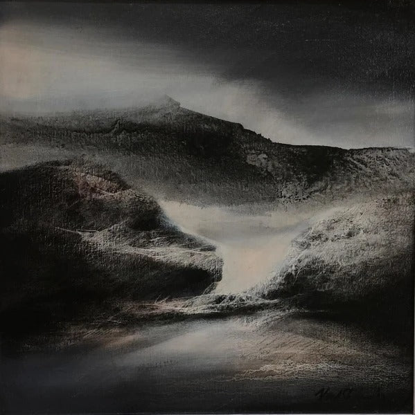 The painting’s surface reveals Sharma’s mastery of layering and erasure. Thin washes and dense impastos coexist, producing a tactile rhythm that mirrors geological time and transformation. The absence of colour heightens the viewer’s sensitivity to texture and light, transforming the canvas into an exploration of visual perception itself. The faint illumination emerging from behind the hills may be read as a metaphor for transcendence, the persistence of hope, spirit, or revelation amid obscurity.